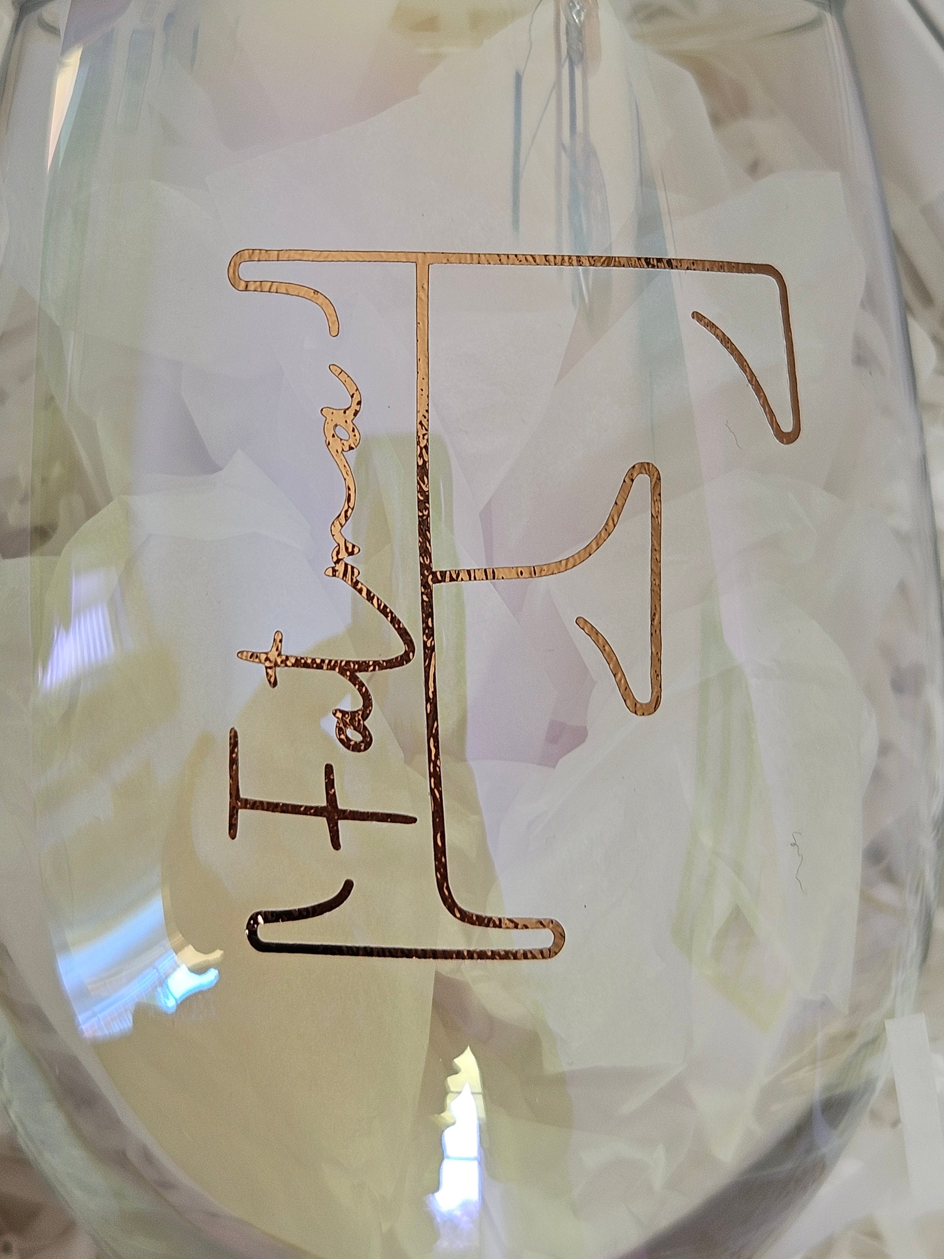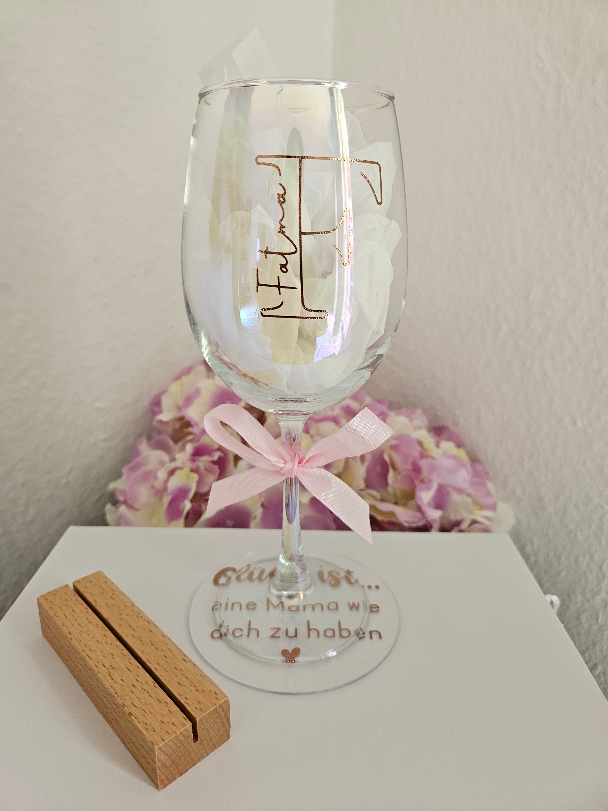 Das runde Acrylglas mit dem Holzaufsteller dient nicht nur als stilvolle Präsentation, sondern kann auch als Untersetzer verwendet werden. Das dazu passende Weinglas wird mit Ihrem Wunschnamen versehen.